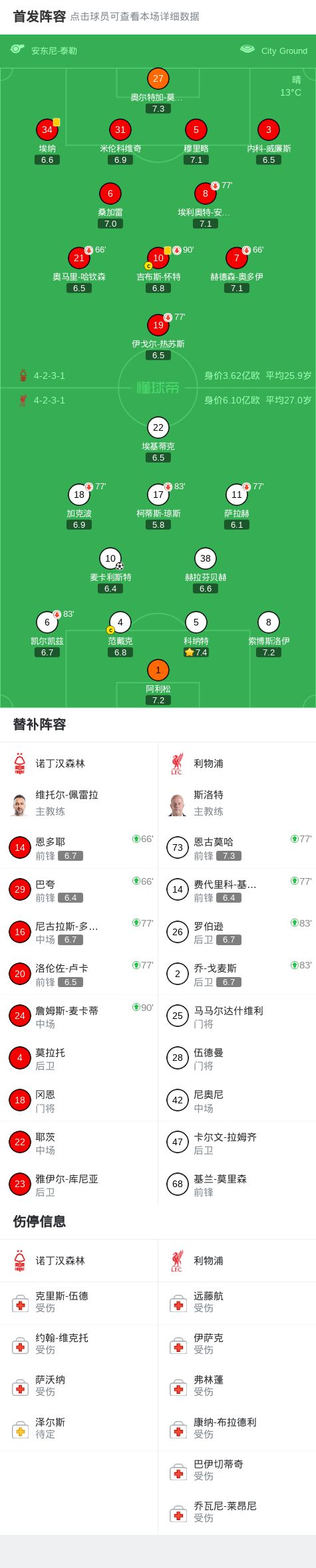 北京时间2月22日英格兰足球顶级联赛 联赛 第27轮,诺丁汉森林主场对阵利物浦。利物浦麦卡利斯特破门。最终比分诺丁汉森林 0-1 利物浦。