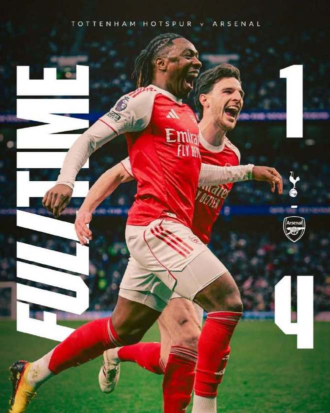 2球落后,图多尔没有犹豫立马换上索兰克、里沙利松和特尔做最后一搏;第83分钟,斯彭斯右路一对一强行突破横传,里沙利松脚后跟嗑向球门,拉亚在皮球即将越过门线前将球捞回,热刺险些追回一球。第94分钟,马丁内利积极反抢断球,马杜埃凯顺势分球,厄德高果断直塞,哲凯赖什顶开格雷后捅射一样梅开二度,4:1!最终在埃泽和哲凯双双梅开二度下,阿森纳本赛季双杀热刺,第一次在英超对热刺拿下4连胜;目前枪手多赛1场暂且领先曼城5分。