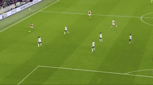 第32分钟,萨卡晃过萨尔后传中,埃泽停球不太利索,但迅速凌空抽射,阿森纳取得领先。