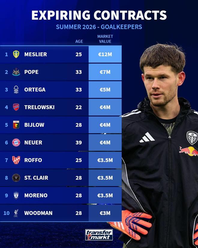 德国转会市场统计了今夏合同到期的十大门将,其中球员按照身价从高到低排序。