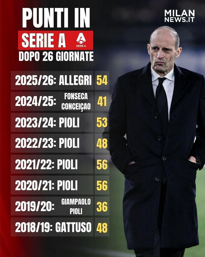 北京时间2月24日,米兰新闻网统计出了AC米兰近8个赛季意甲前26轮过后的成绩,本赛季阿莱格里率队拿到54分为近8个赛季的第二高积分。