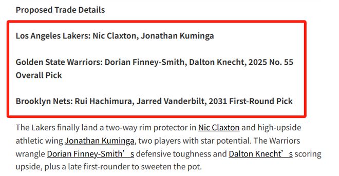 这笔三方交易堪称三赢。湖人通过得到克拉克斯顿,填补了浓眉离开后留下的防守空缺,库明加的加盟,则为湖人的首发阵容注入了进攻活力,他成本可控且运动能力出众,有望与球队共同成长。勇士在芬尼 - 史密斯身上找到了外线防守和三分火力的完美结合,他以合理的薪资为球队提供了稳定的3D表现。克内希特可以培养为下一个克莱,为未来储备了足够的人才。篮网则不断积累未来资产!如果这笔交易能够最终达成,无疑将在NBA联盟中引发一系列连锁反应,重塑三支球队的未来走向。